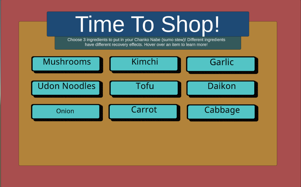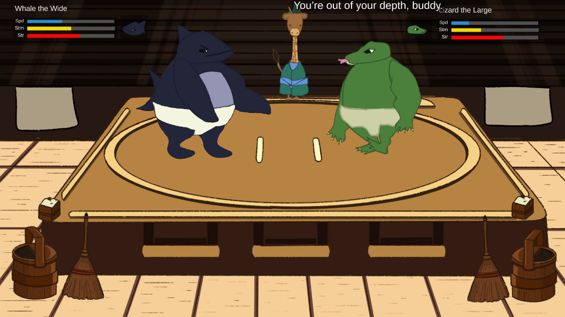 The game is a sumo wrestling game. The actual combat is confusing and hard to play but it has a lot of character and was fun to work on. Everyone did a great job but I think the best part of the game was the music. Poltergeisha did a great job coming up with our music.