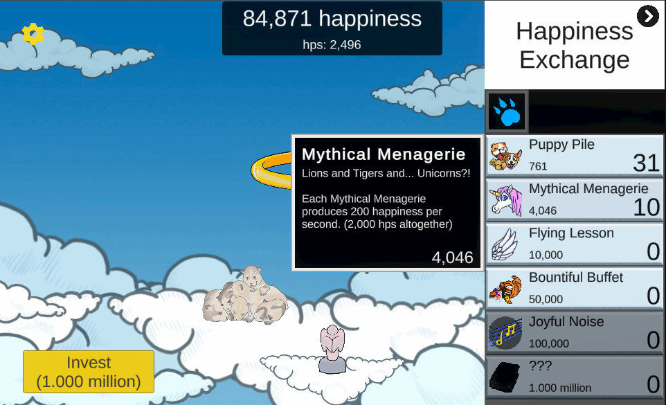 Luckily power was restored relatively quickly for us. Many other parts of the city were without power for a week. Our original plan was to make a top down 2D game where the player is a grave robber. The player traverses a graveyard digging up graves to find loot while hiding from patrolling security. Due to the time loss we decided to scrap it and go with our second idea which was a idle clicking game similar to Cookie Clicker.